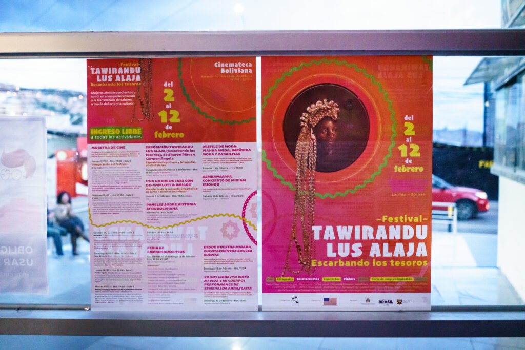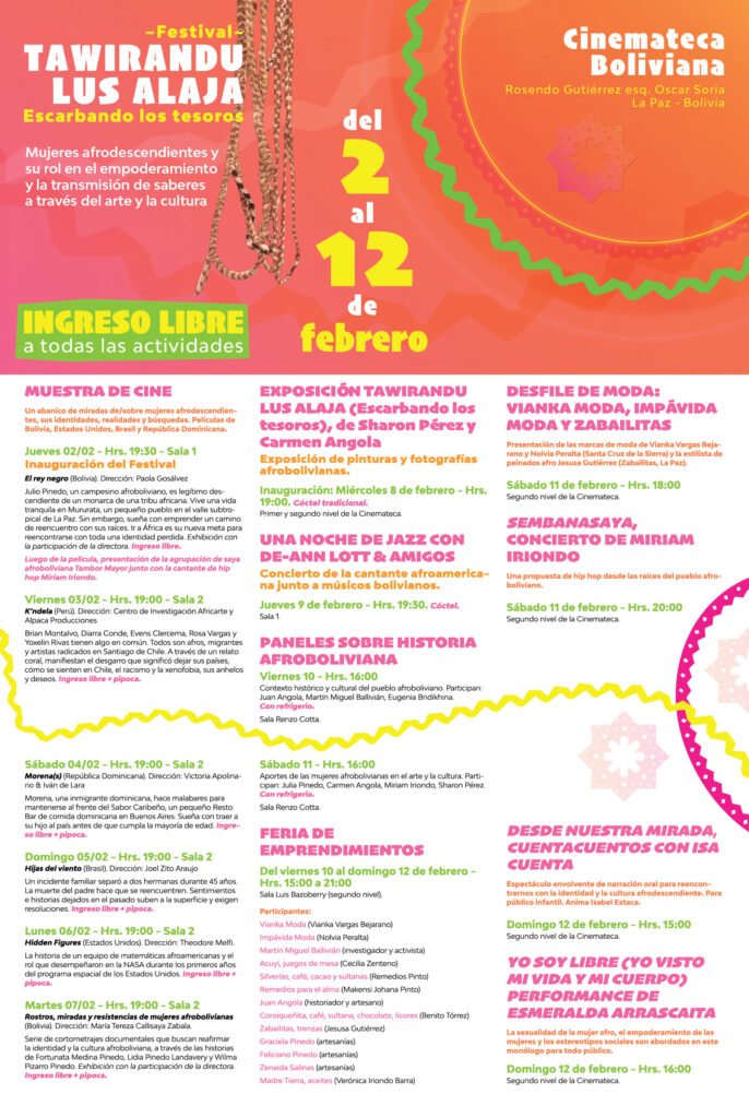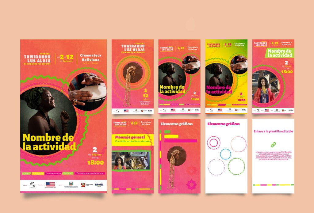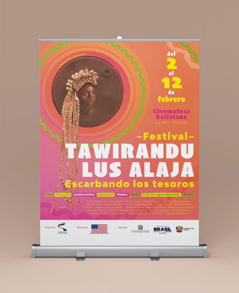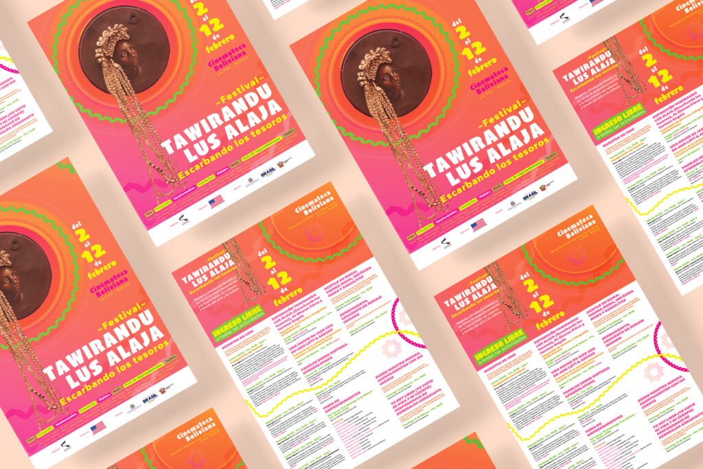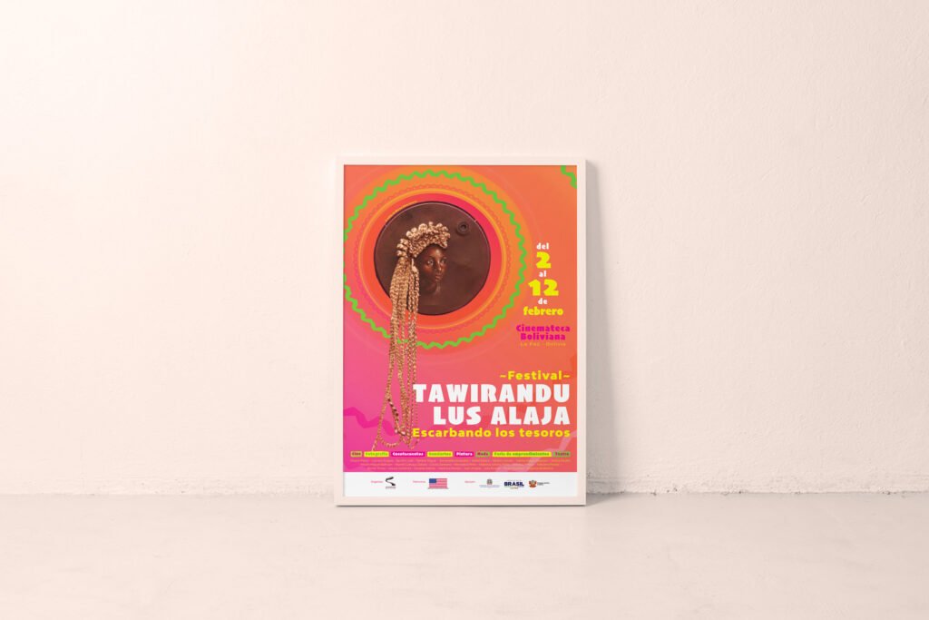 Tawirando Lus Alaja (Escarbando los tesoros) es un festival para la difusión del trabajo de Mujeres afrodescendientes y su rol en el empoderamiento y la transmisión de saberes a través del arte y la cultura. Nos encargaron la línea gráfica del evento, que debía utilizar una obra seleccionada de la artista afro-boliviana Sharon Pérez. Diseñamos un afiche/programación, un banner, un panel informativo y les proporcionamos una plantilla de Canva para que puedan realizar posteriormente una serie de artes para redes sociales anunciando cada uno de los eventos.